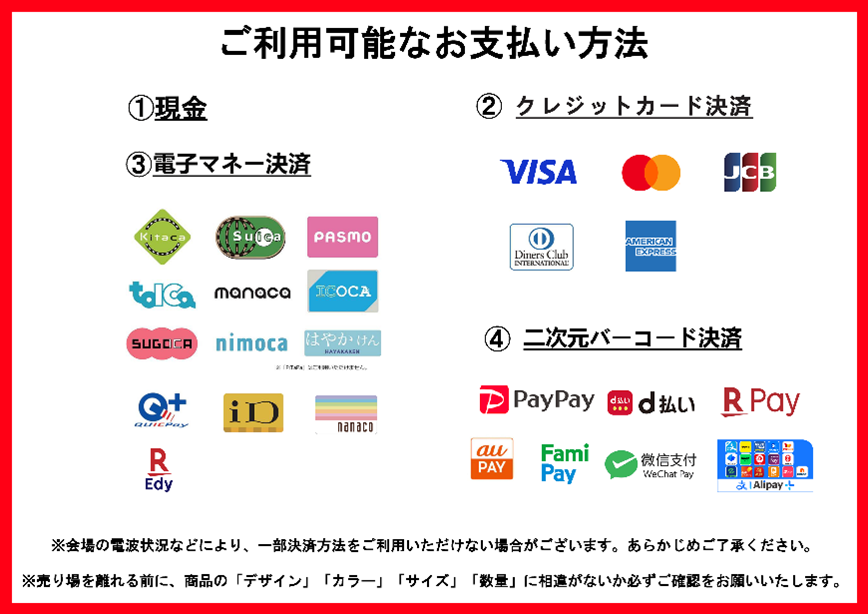 ・会場では現金でのお会計に加え、下記キャッシュレス決済方法がご利用いただけます